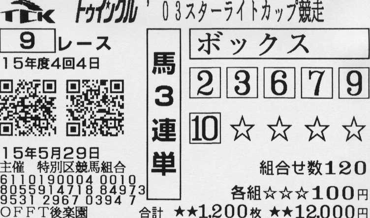 ■投票方法:関東地区スポニチ誌の予想公開印の総て〔◎○×▲△△:計6点〕の3連単BOX投票